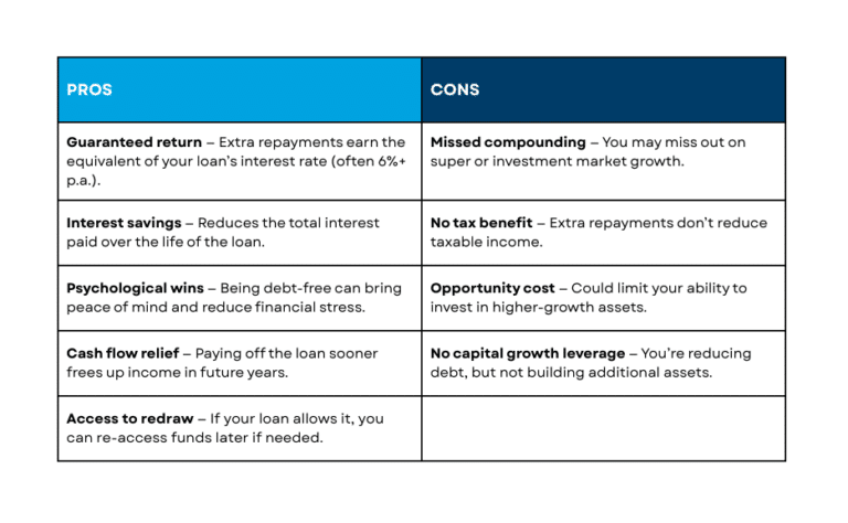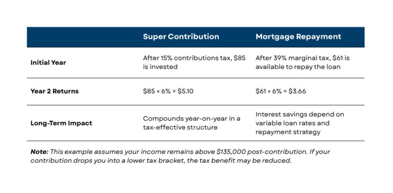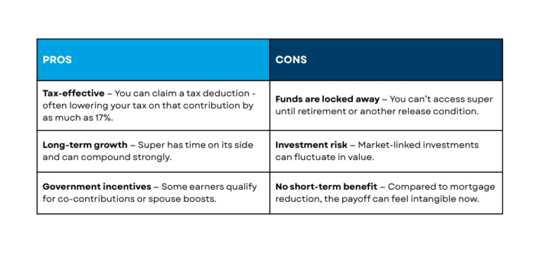 In many cases, superannuation comes out ahead on the numbers. Your contribution benefits from an immediate tax deduction and then continues to work harder within the super environment thanks to the concessional tax rate and a long-term investment strategy that should outpace home loan interest rates.